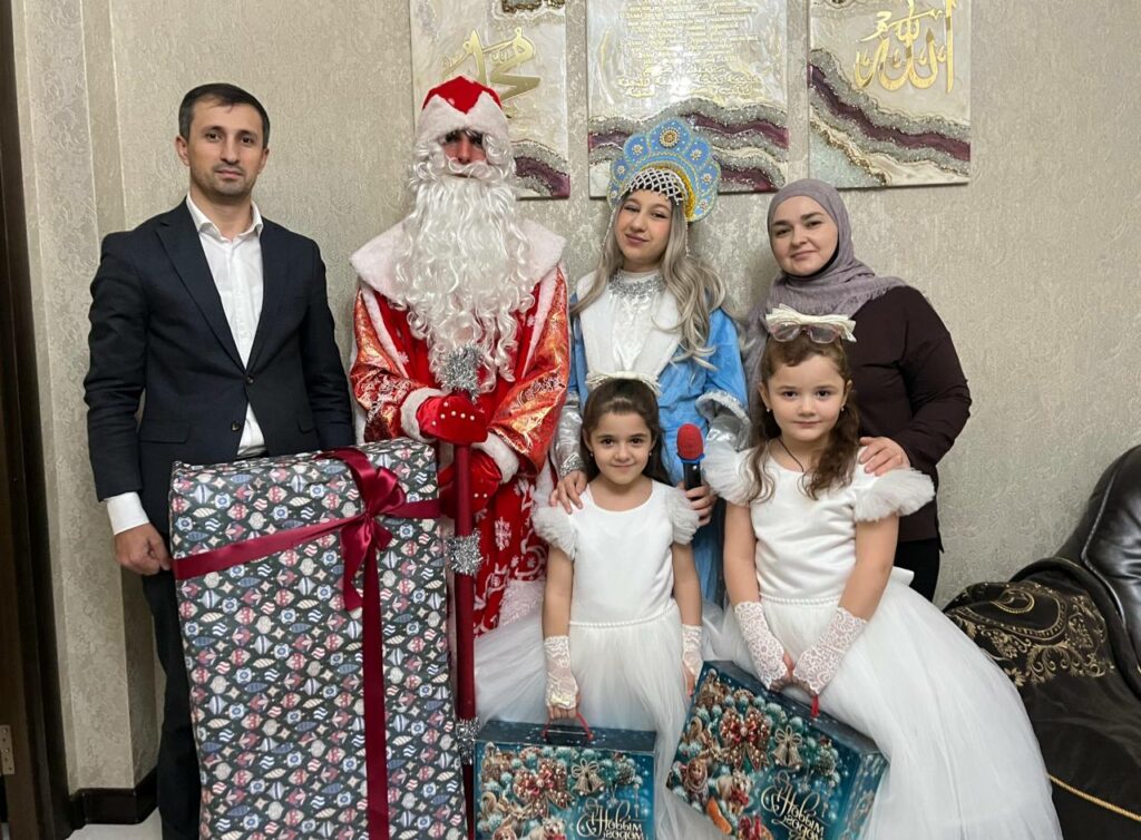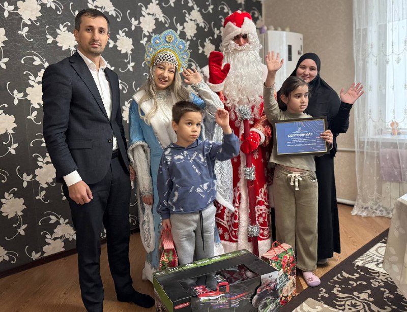 Хизроев вместе с Дедом Морозом и Снегурочкой также навестил семью Казбековых, где воспитываются двое погодок с расстройствами аутистического спектра. Восьмилетнему Магомед‑Камилю, мечтавшему о сюрпризе, подарили машину на пульте управления. Девятилетней Юлдуз вручили сертификат на посещение дельфинария с возможностью просмотра шоу и плавания с дельфином.