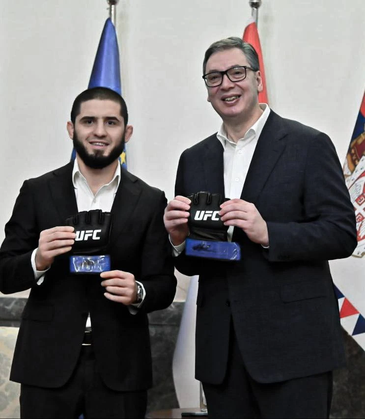 Ислам Махачев приехал на встречу с президентом Сербии Александром Вучичем не с пустыми руками и подарил ему перчатки, в которых он стал чемпионом в полусреднем весе, победив австралийца Джека Деллу Маддалену.