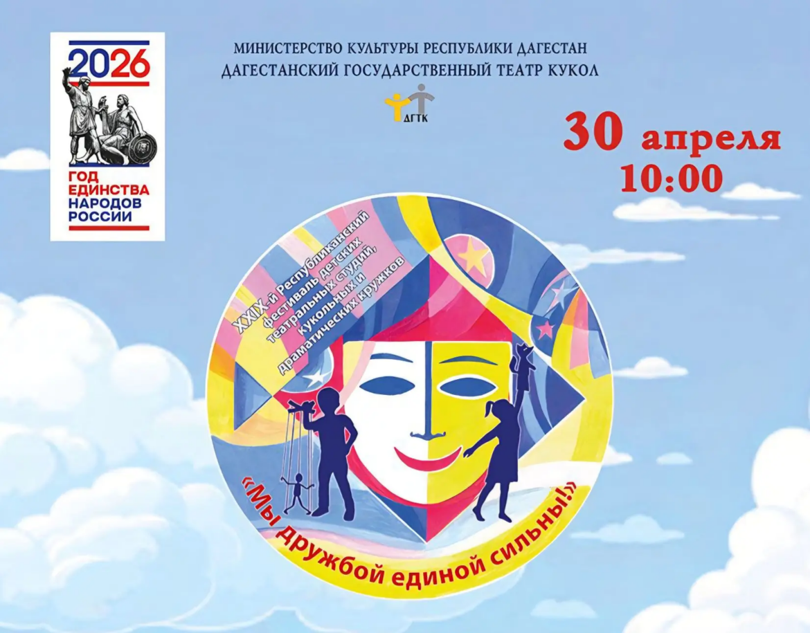 30 апреля Дагестанский государственный театр кукол проведет XXIX Республиканский фестиваль детских театральных студий, кукольных и драматических кружков «Мы дружбой единой сильны». Мероприятие приурочено к Году единства народов России.