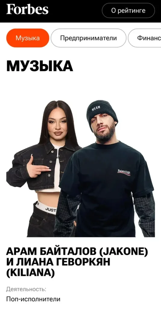 Jakone и Kiliana — поп-дуэт. Арам из Ростовской области, Лиана из Таганрога. Их хит «Асфальт» собрал 30 млн стримов и 232 млн просмотров на YouTube. В 2026 году дуэт вошёл в топ-100 российских исполнителей на Яндекс Музыке.