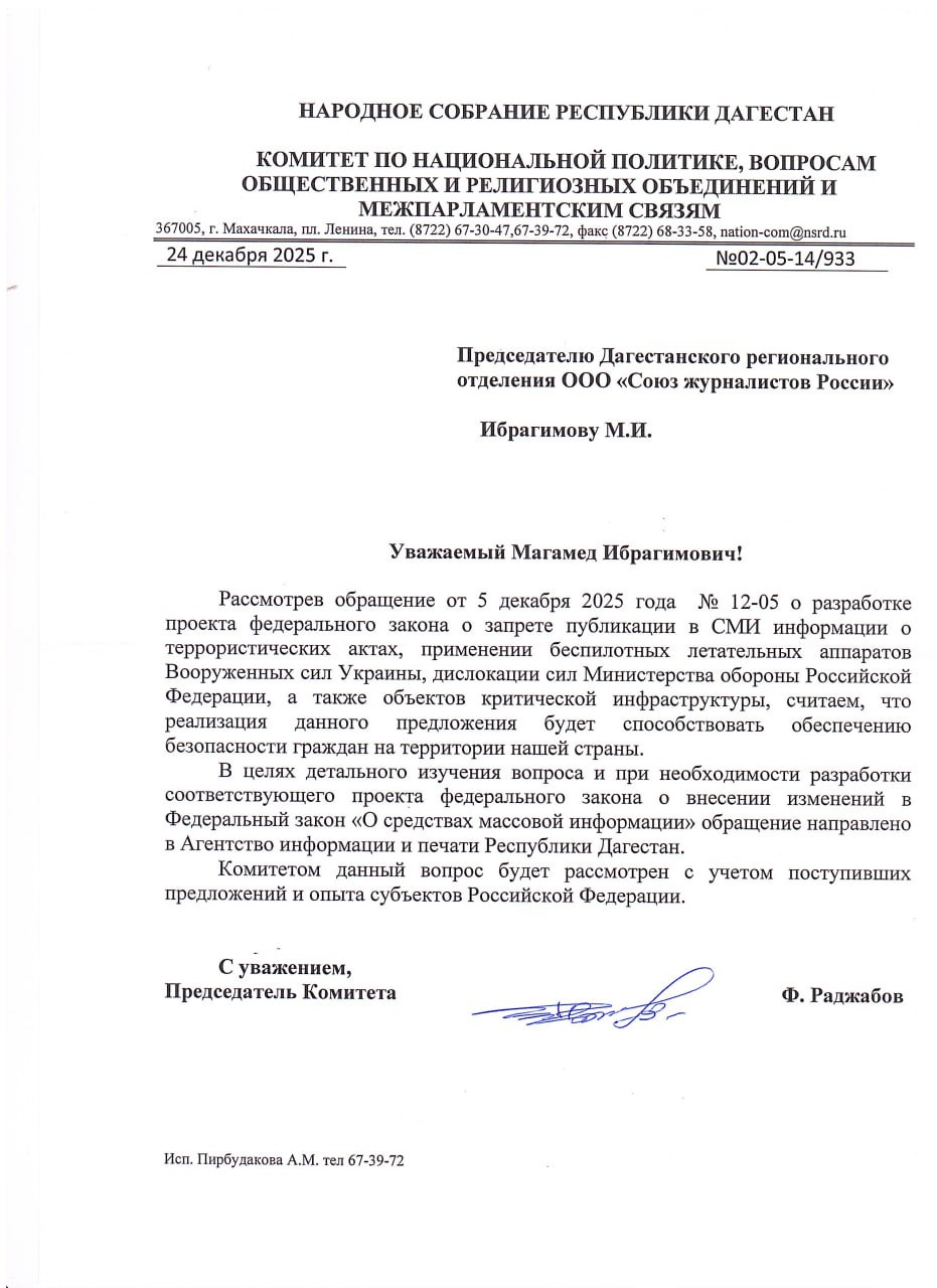 Дагестанское региональное отделение Союза журналистов России получило ответ от Народного Собрания Республики Дагестан на обращение журналистов о соблюдении запрета на публикацию информации о терактах и ударах дронов, установленного Указом Главы Республики.
