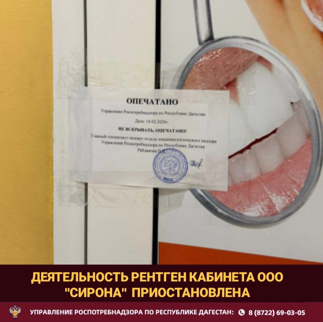 Управление Роспотребнадзора по Республике Дагестан приостановило деятельность рентген-кабинета в стоматологической клинике ООО «Сирона» в результате плановой выездной проверки.