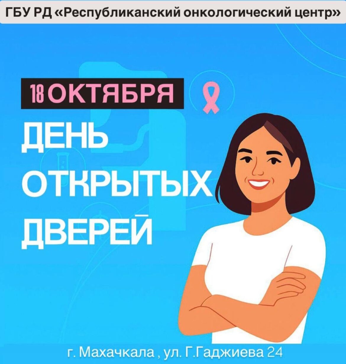 Акция пройдет в субботу, 18 октября, с 9:00 до 13:00 в новом корпусе Республиканского онкологического центра по адресу: г. Махачкала, ул. Гайдара Гаджиева 24 (Акушинского 24).