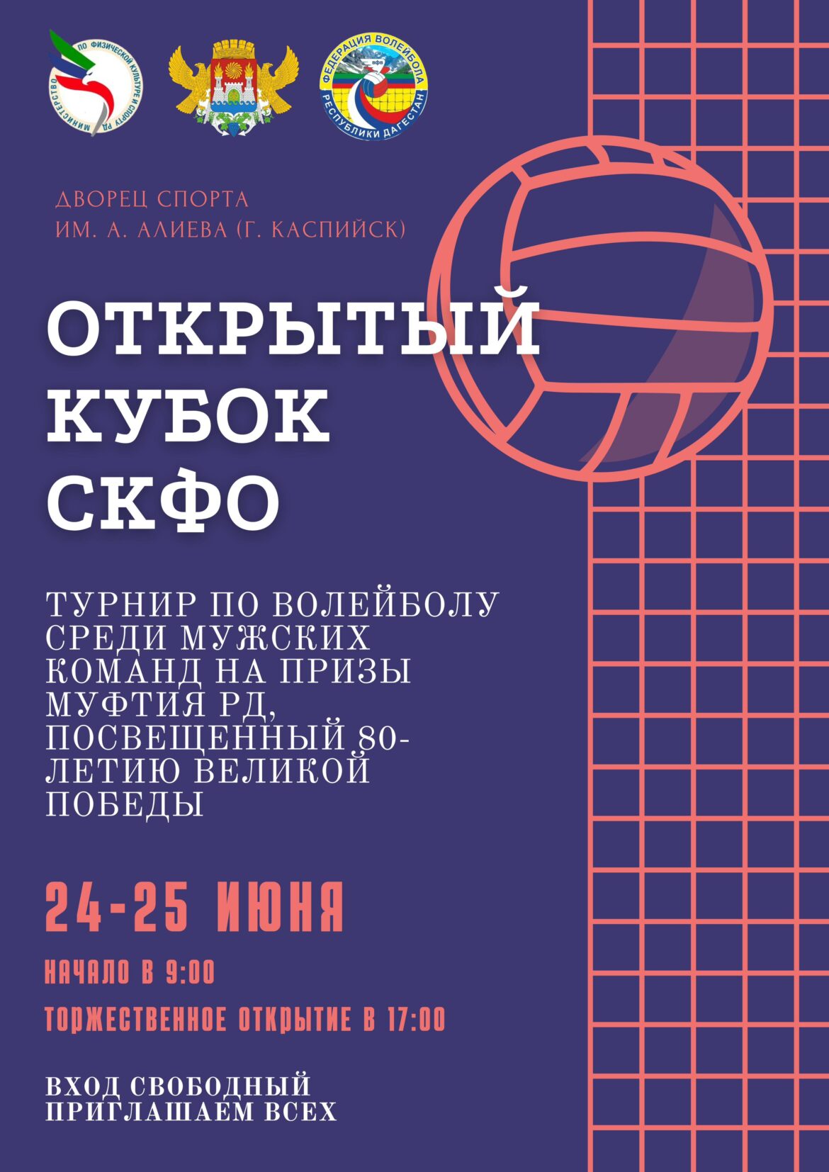 24 и 25 июня во Дворце спорта имени Али Алиева в Каспийске состоится Открытый Кубок СКФО по волейболу среди мужских команд. Турнир, посвященный 80-летию Победы, проводится на призы Муфтия Дагестана шейха Ахмада-афанди Абдулаева.