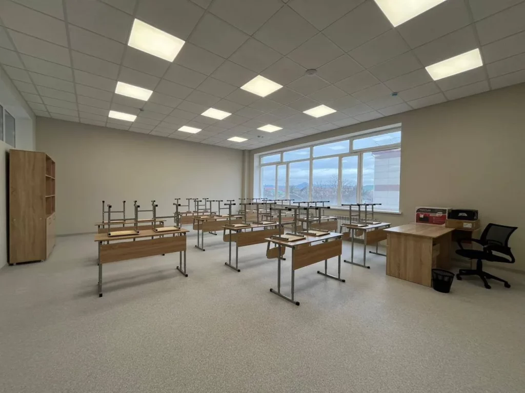 Здание возводится с учетом современных требований к качеству и безопасности. В классах выполнен ремонт, установлена новая мебель, продумано цветовое оформление помещений.