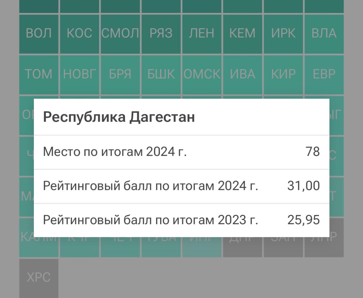 Дагестан занял 78 строчку в списке. Рейтинговый балл региона составил 31,00, что немного выше показателей за 2023 год (25,95).